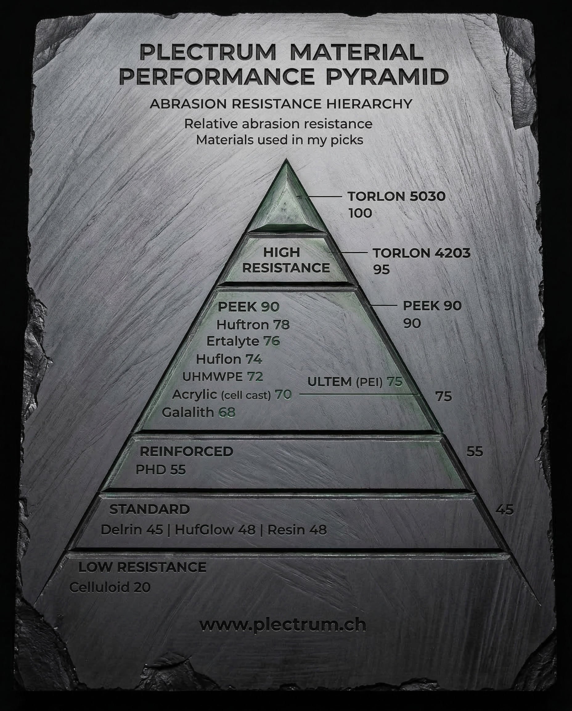 Hypothetically, comparing the abrasion resistance and lifespan of innovative materials like Torlon and PEEK to traditional ones such as Celluloid and Delrin reveals stark differences. Engineered for intense wear, Torlon and PEEK significantly outlast standard materials, offering musicians a durable alternative that withstand extensive, rigorous use:
